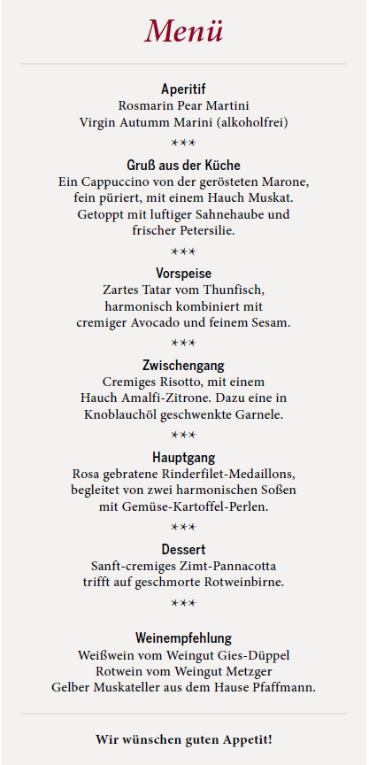 Da wir für dieses exklusive Abendessen nur über eine begrenzte Platzzahl verfügen, möchten wir Sie bitten, sich vorher anzumelden – persönlich an der Rezeption, telefonisch oder per E-Mail.